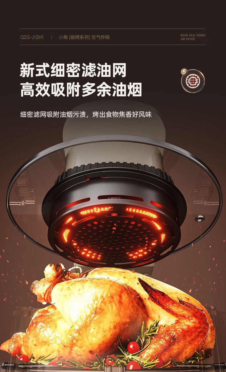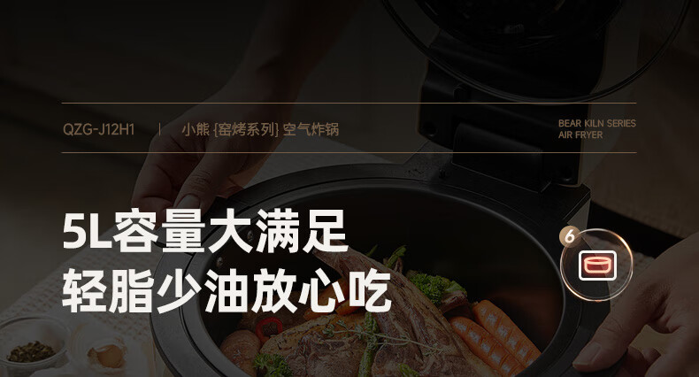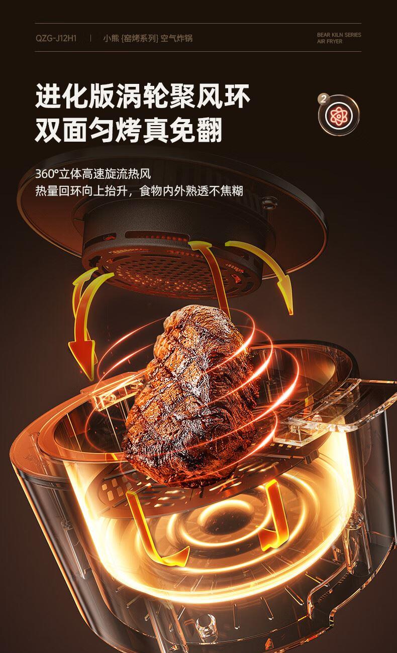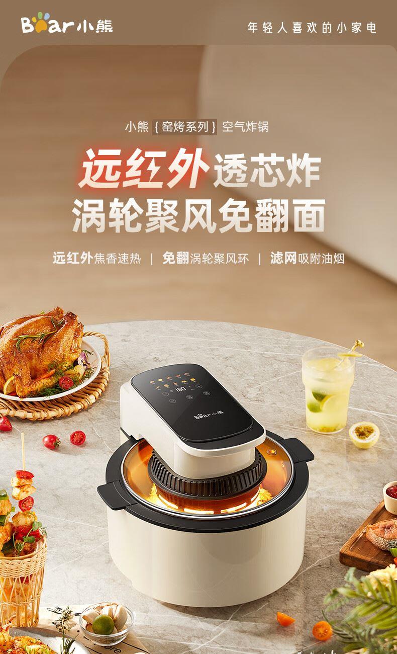 5L大容量; 可视大视窗; 大彩屏触控; 免翻面烤炸 涡轮聚风环; 升级远红外光波管热力透芯 焦香扑鼻。