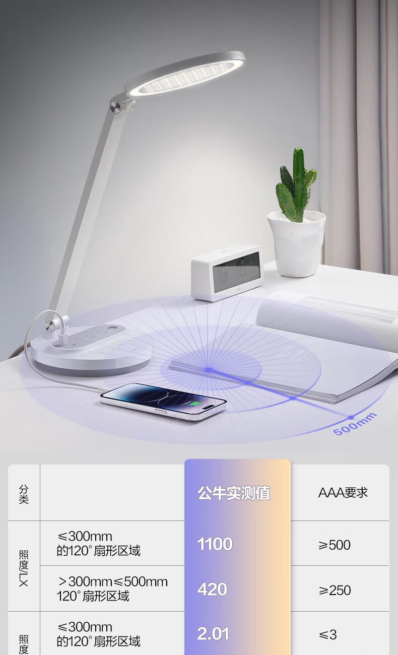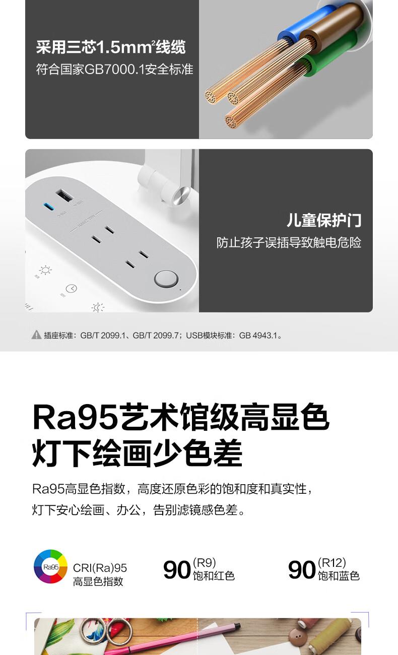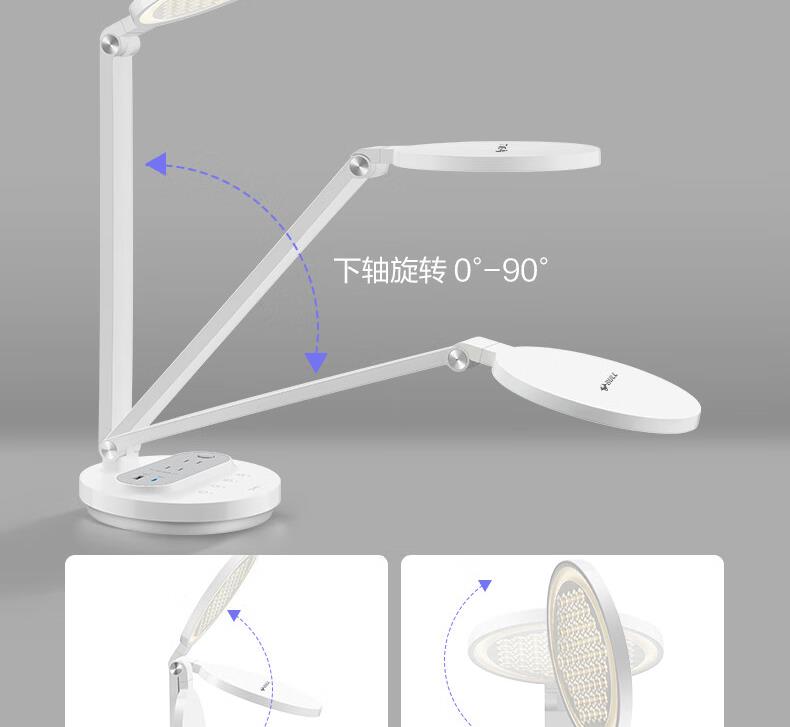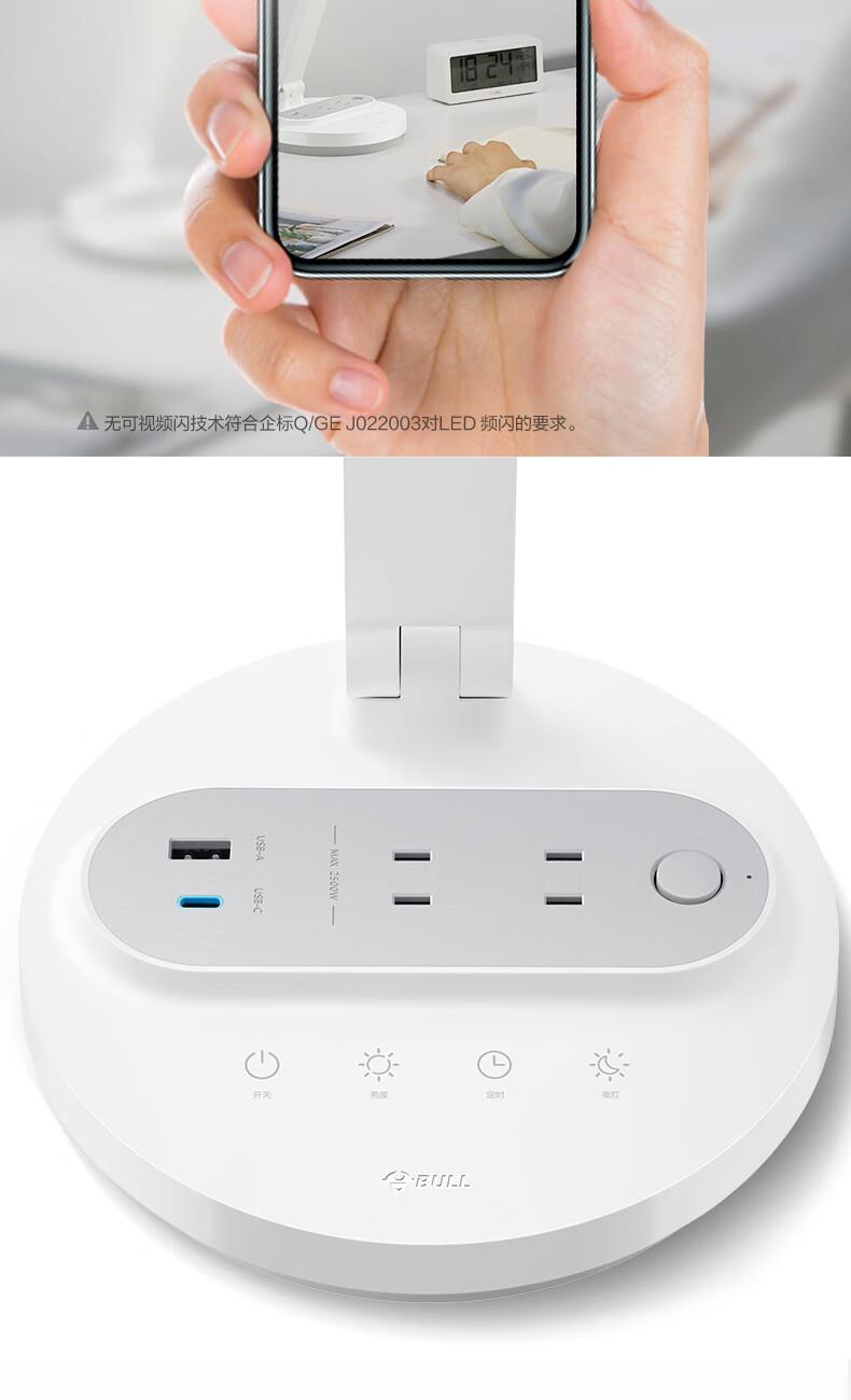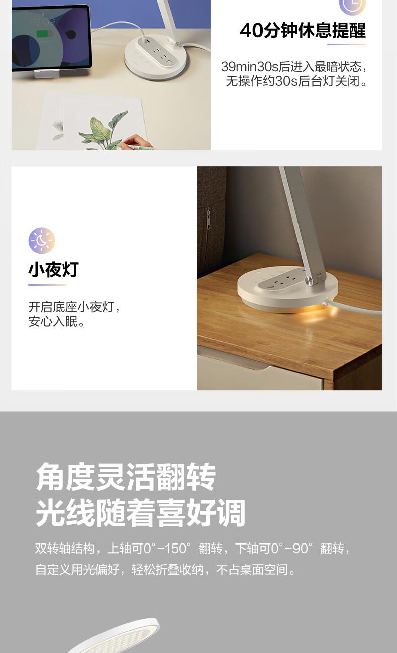 参数: 插座额定电压:250V~ 输出口:USB多口/USB-A单口/Type-C单口输出 材质:ABS、PC LED灯色温:主灯4000K、夜灯3000K 规      格 : 12只/箱 产品尺寸:400x175x267mm 卖点: 【67W快充】USB-C口支持单口输出PD 67W; 【防蓝光、无可视频闪】呵护明亮双眸,防蓝光危害,呵护双眼,减轻用眼疲劳度; 【蜂窝透镜】升级第二代蜂窝防眩一体化设计,加大防眩角度,有效减少直接眩光和反射眩光对眼睛的伤害,光线细腻柔和,不易眩目; 【高品质转轴】双转轴结构,上轴可0°-150°翻转,下轴可0°-90°翻转,自定义用光偏好,轻松折叠收纳,不占桌面空间; 【无极调光】亮度自定义,调节尽在指尖,舒适用光更爱眼