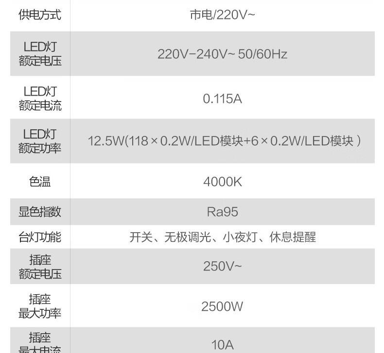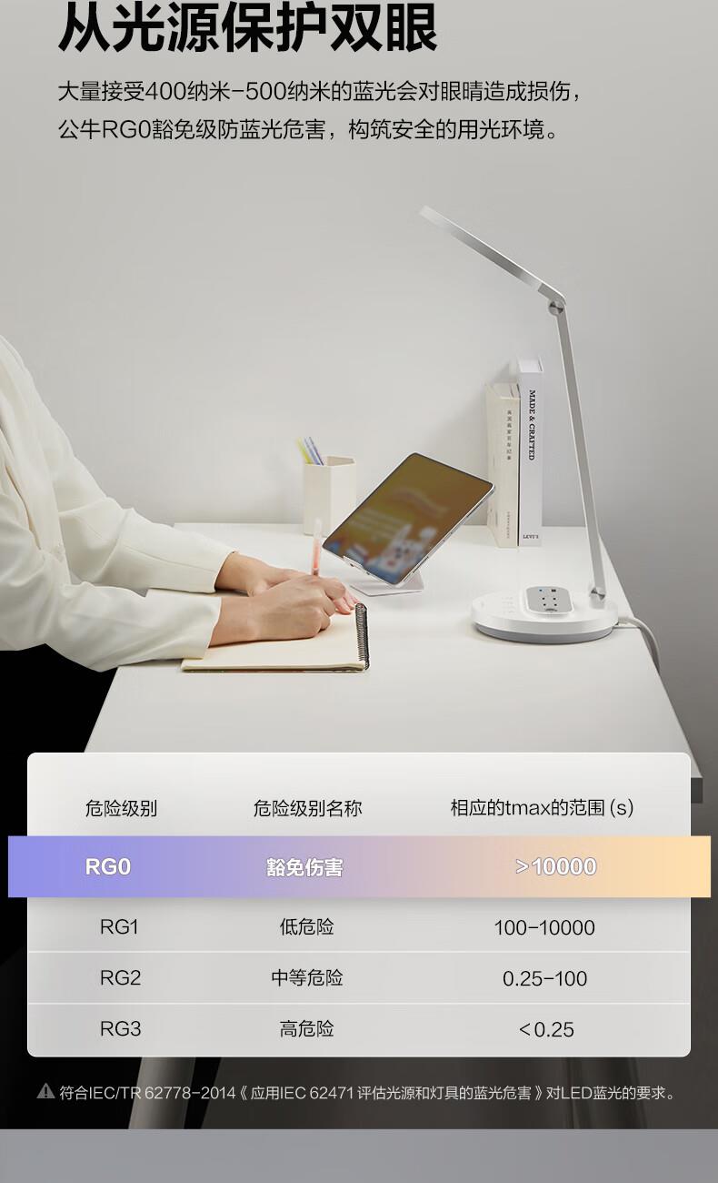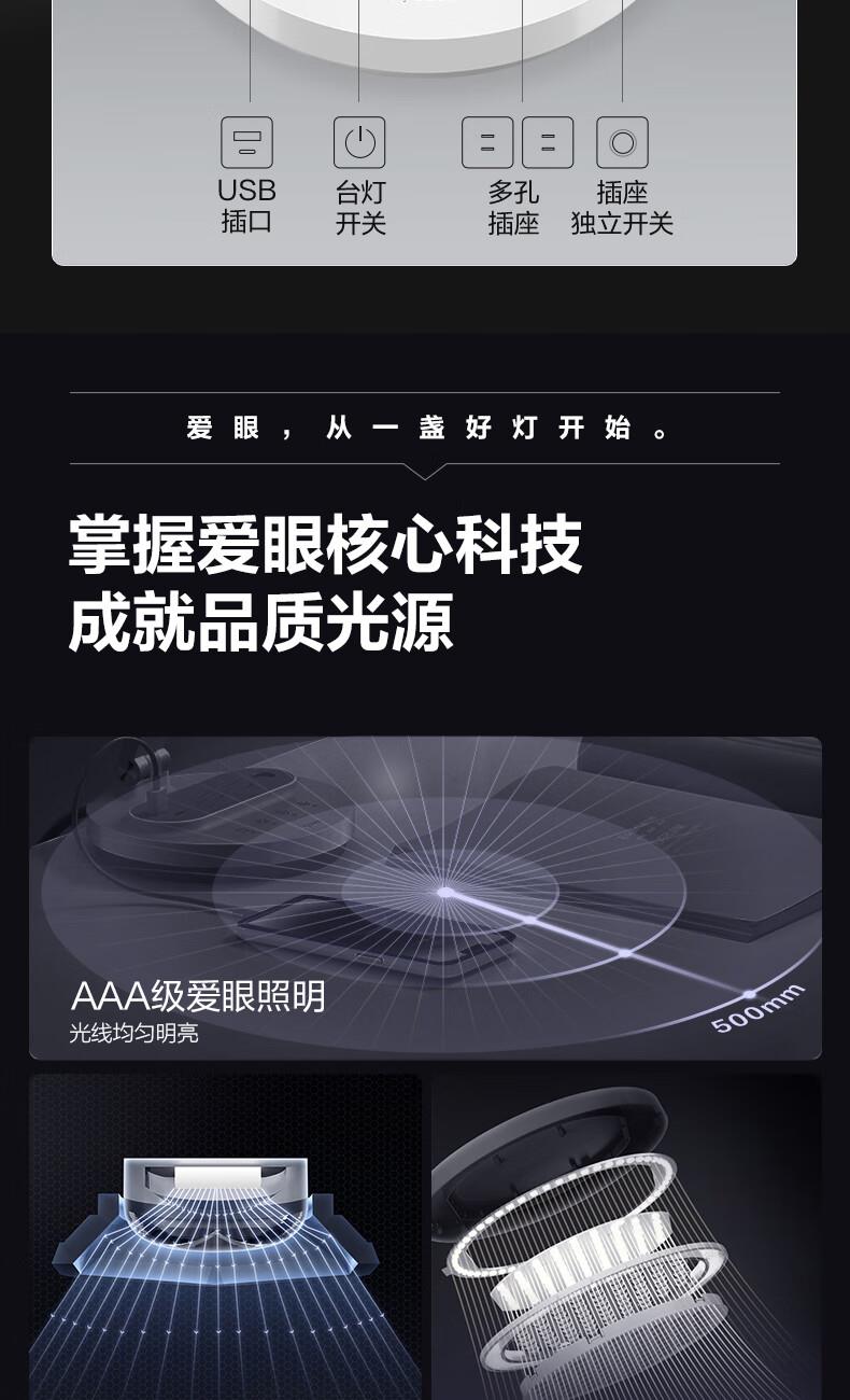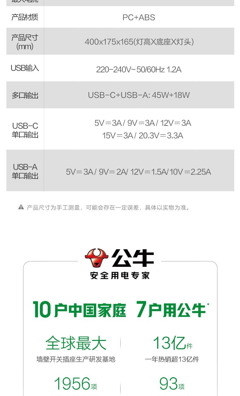 参数: 插座额定电压:250V~ 输出口:USB多口/USB-A单口/Type-C单口输出 材质:ABS、PC LED灯色温:主灯4000K、夜灯3000K 规      格 : 12只/箱 产品尺寸:400x175x267mm 卖点: 【67W快充】USB-C口支持单口输出PD 67W; 【防蓝光、无可视频闪】呵护明亮双眸,防蓝光危害,呵护双眼,减轻用眼疲劳度; 【蜂窝透镜】升级第二代蜂窝防眩一体化设计,加大防眩角度,有效减少直接眩光和反射眩光对眼睛的伤害,光线细腻柔和,不易眩目; 【高品质转轴】双转轴结构,上轴可0°-150°翻转,下轴可0°-90°翻转,自定义用光偏好,轻松折叠收纳,不占桌面空间; 【无极调光】亮度自定义,调节尽在指尖,舒适用光更爱眼